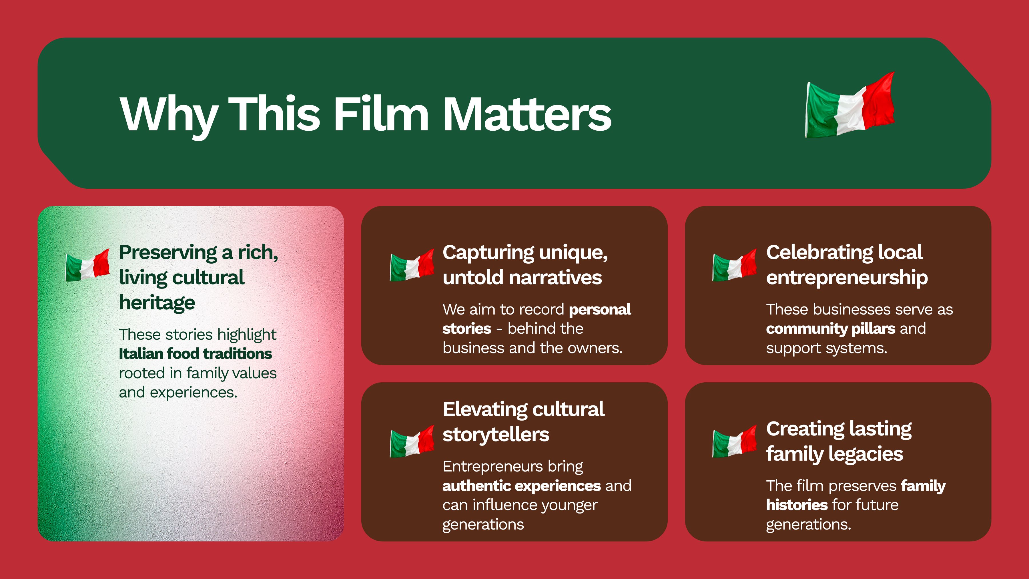 This documentary tells the family stories behind Italian food businesses, uncovering how tradition, culture, and immigrant roots shaped both the people and the businesses they built.